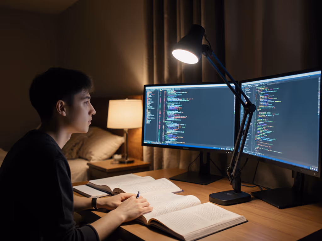 Don't trust bulb specs. Measure at the desk. Tape grid points where your notebook, keyboard, and secondary screen sit. Borrow a lux meter (many universities loan them) and log: