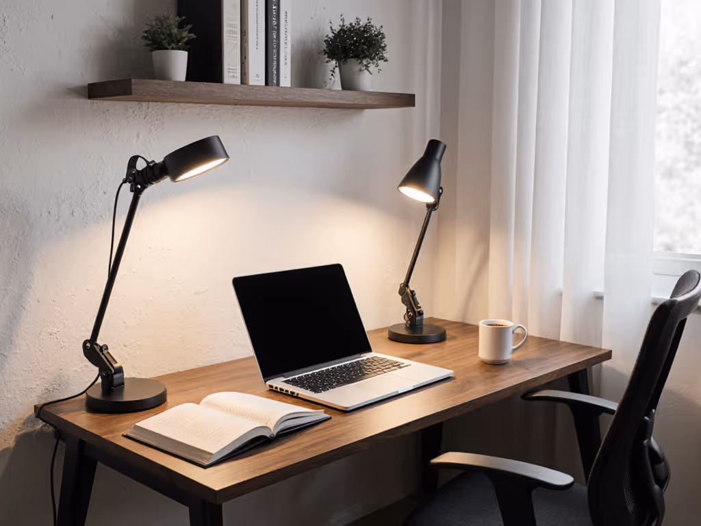 Use asymmetric lighting that illuminates the desk without washing over screens. Position lamps to the side of your primary viewing axis (never directly behind or in front of screens).